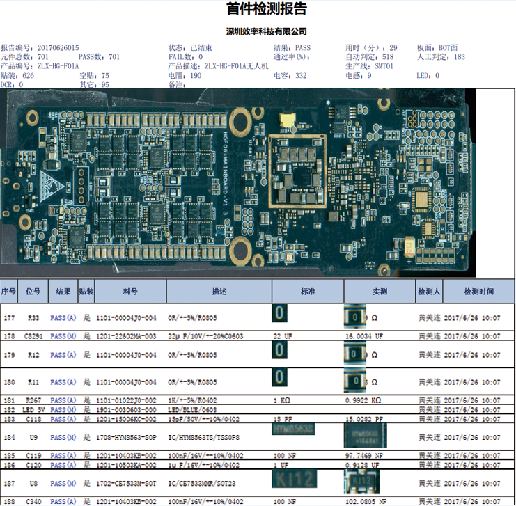 2.自動生成完善的檢查報告:檢測完成可自動生成完善的不可更改的檢測報告,方便追溯問題源頭(每一個位號都有絲印對比圖及測量值);同時也省去了人工做報告的繁瑣和時間;真實反映實際情況,避免了人為修改和失誤。
