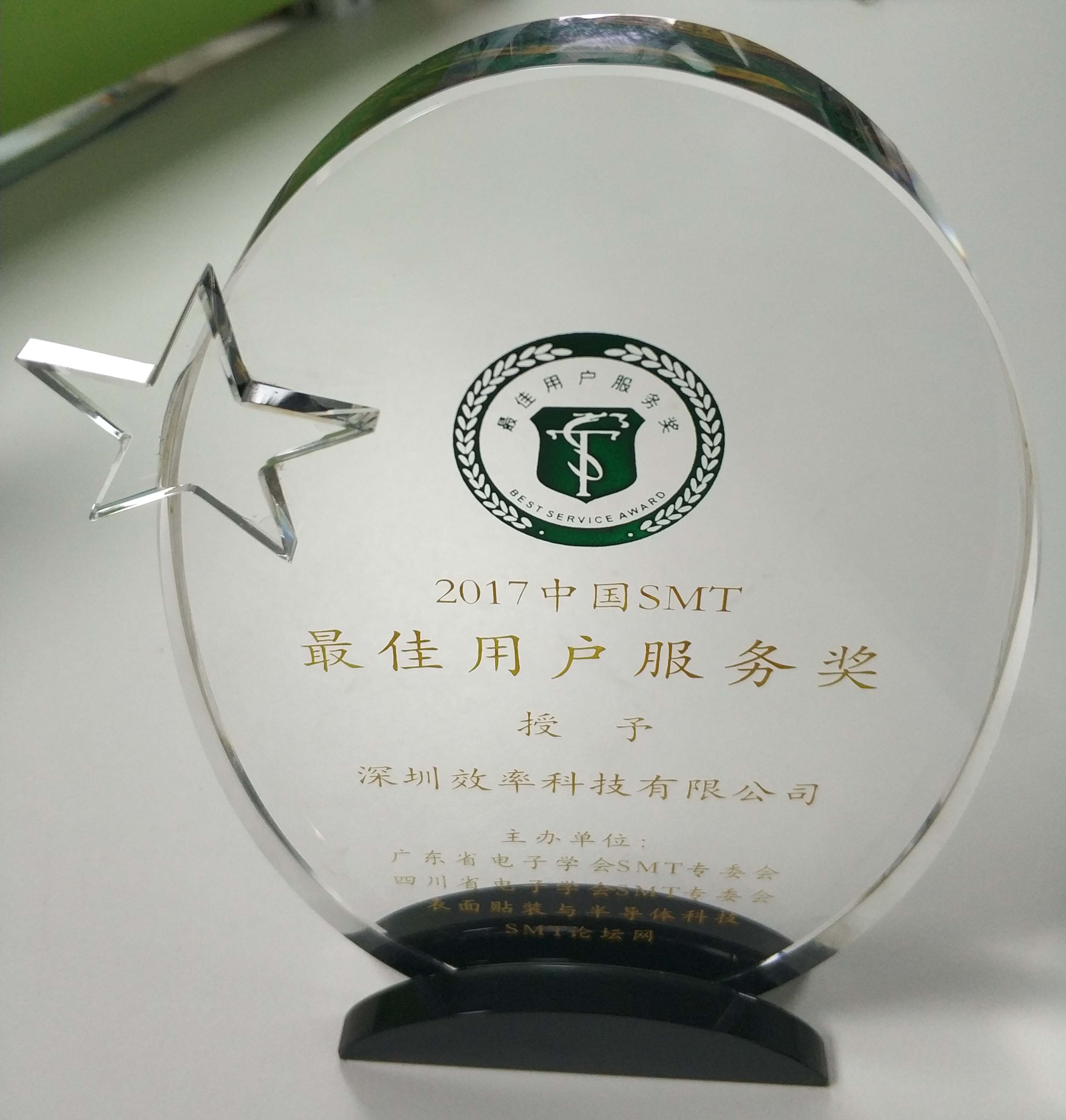 繼2015年我司獲得“中國SMT創(chuàng)新成果獎(jiǎng)”之后,2017年,我司又榮獲了中國SMT “最佳用戶服務(wù)獎(jiǎng)”。這表明我司不僅擁有雄厚的技術(shù)研發(fā)實(shí)力,我司優(yōu)質(zhì)的售后服務(wù)質(zhì)量也得到了客戶的贊賞和認(rèn)可,在服務(wù)類別中脫穎而出拔得頭籌。
