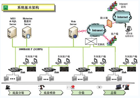 效率科技所提供的MES系統(tǒng)是結(jié)合A公司拖拉機生產(chǎn)區(qū)的企業(yè)局域網(wǎng)的總體的規(guī)劃要求、生產(chǎn)管理及調(diào)度流程標準、企業(yè)工藝編碼規(guī)則,建立的一個技術(shù)先進適用、運行安全可靠的網(wǎng)絡(luò)體系。MES系統(tǒng)通過車體條碼數(shù)據(jù)采集管理,實現(xiàn)車體的實時的流轉(zhuǎn)跟蹤,為保證總裝和分裝線節(jié)拍的一致、了解和調(diào)度車間生產(chǎn)提供了可視化平臺;通過裝配線邊的觸摸屏動態(tài)顯示線上主機的裝配指示,減少錯漏裝現(xiàn)象,提高裝配質(zhì)量;通過對關(guān)重件的掃描管理,實現(xiàn)拖拉機生產(chǎn)履歷的及時和準確的記錄,為實現(xiàn)質(zhì)量追溯以及及時召回提供支持;通過對裝配線的啟停記錄和原因統(tǒng)計分析,實際對兩條主裝配線效率的分析。同時,由于A公司拖拉機生產(chǎn)區(qū)是一個全新的運行模式,因此,MES系統(tǒng)充分考慮了系統(tǒng)的開放性與可擴充性的能力,網(wǎng)絡(luò)系統(tǒng)能在生產(chǎn)運行過程中,能夠具有不斷摸索、持續(xù)改進、充實完善的能力。