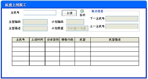 如:31000001(三裝+2010年+00001主機序號),主機號產(chǎn)生后,即產(chǎn)生主機上線預(yù)備隊列,數(shù)據(jù)保存到分裝線生產(chǎn)表