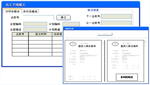 每臺主機下線檢查合格后,需要打印合格證。合格證打印位于質(zhì)檢線后,當(dāng)主機到達該工位后,操作人員通過選擇主機號碼,確認后系統(tǒng)自動打印出該主機的合格證和主機條碼。