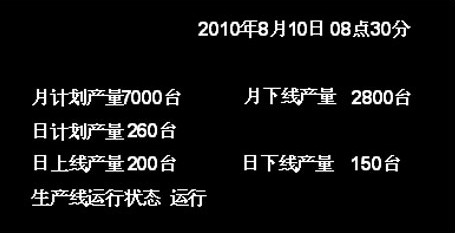 LED顯示MES系統(tǒng)的生產(chǎn)實時統(tǒng)計數(shù)據(jù)和用戶定義消息。生產(chǎn)信息包括指定的生產(chǎn)匯總信息、計劃產(chǎn)量信息,實際產(chǎn)量信息。用戶定義消息,提供用戶輸入的歡迎消息。LED信息格式: