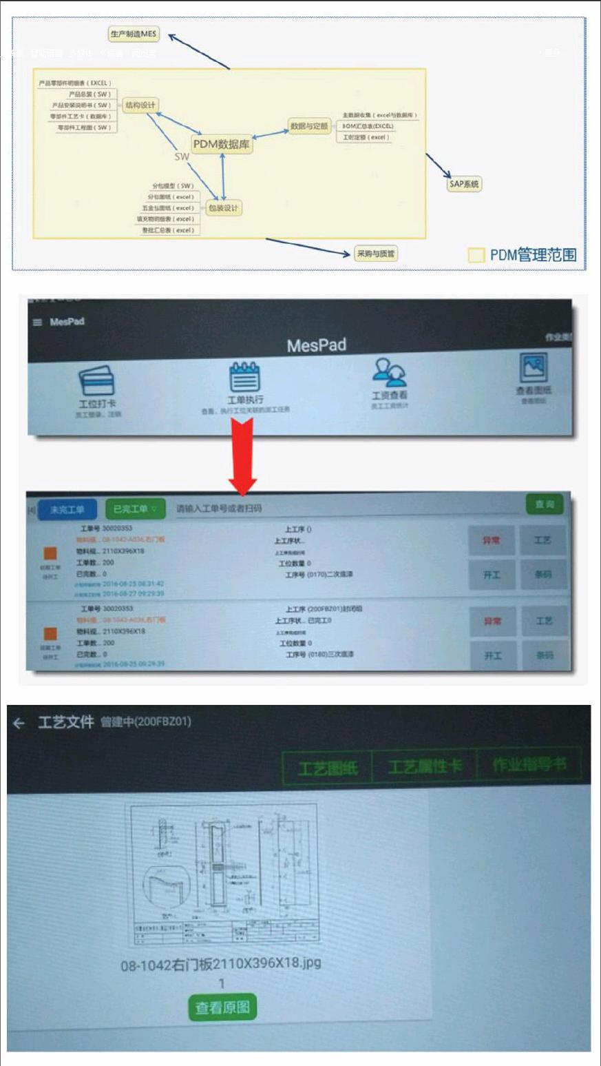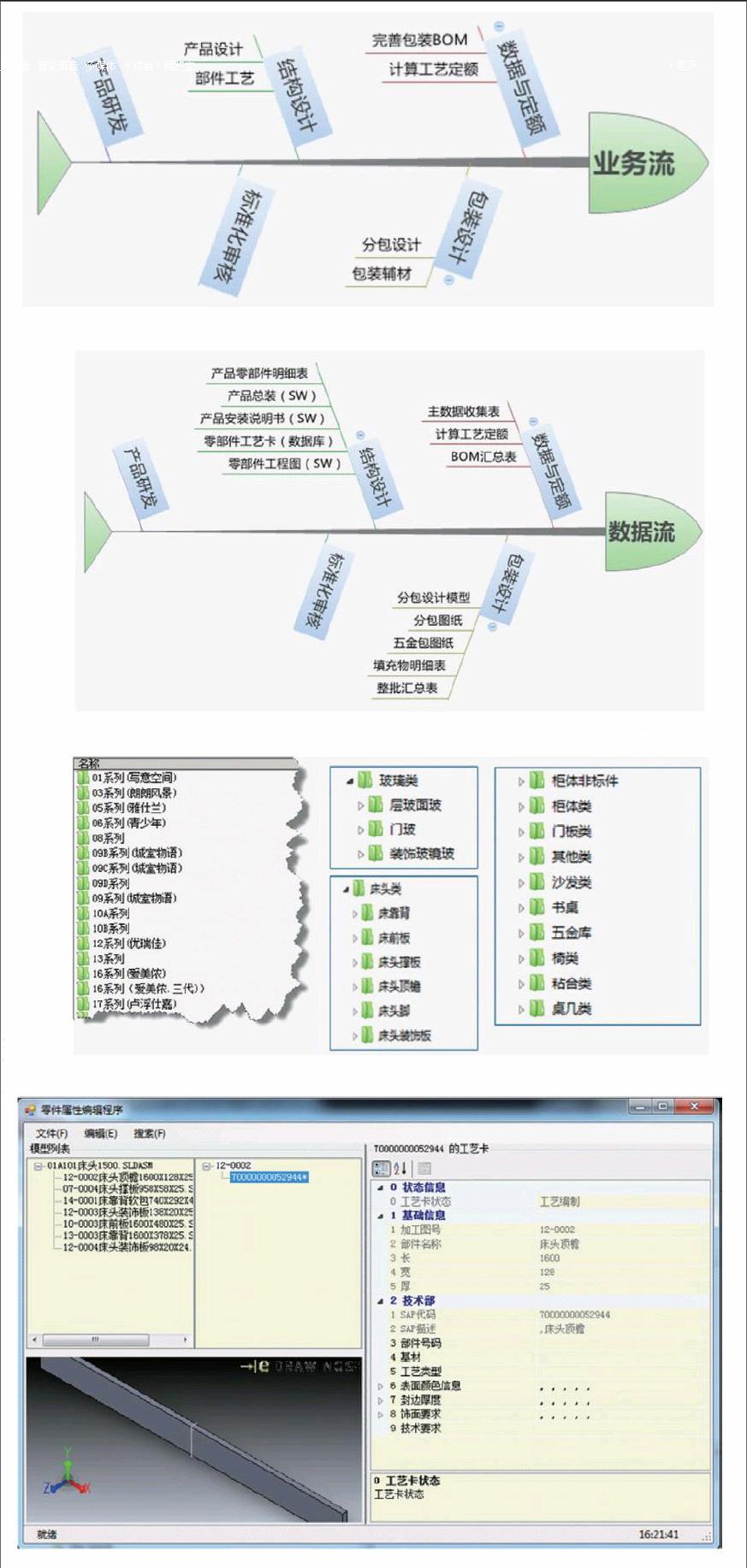 這是一家集研發、生產、銷售和服務于一體的大型現代家居企業,自主研發和生產的產品以板式家具為主。企業長期以來都非常重視整體信息化建設,早在2008年就采用了SAP ERP的解決方案,后又采用SOLIDWORKS CAD/CAE/PDM的整體解決方案,建立了基于三維的數字化研發管理平臺,以解決各信息化系統的數據源頭問題。在MES方面,企業也做了非常多的研究和探索,目前在制造環節已得到了廣泛的應用。