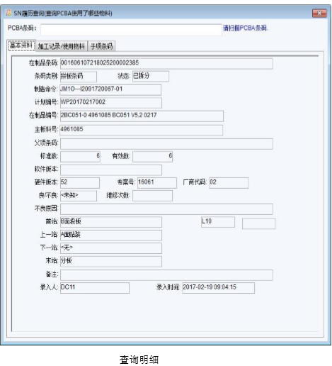 1. 每小塊板可查詢到每個工站(投板/AOI 檢測/維修)的信息(時間/操作人員/產(chǎn) 品狀態(tài)。
