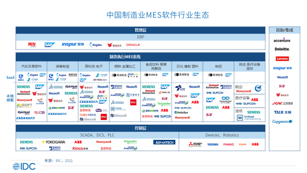 ??IDC調研分析了中國制造業MES軟件行業的主要供應商,既有在行業深耕多年,精通行業機理的行業供應商,又有在設備控制、企業資源管理積累多年的技術供應商,還有掌握數據驅動、先進開發模式的新興供應商。MES軟件市場供應商眾多,市場高度分散,隨著新興技術的下沉及新勢力的涌入,看似表面平靜的市場之下暗流涌動。