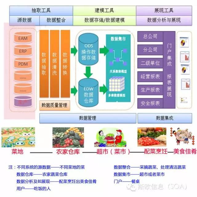 媽媽配菜,媽媽根據家人一天要吃的菜肴規劃,挑選各種各樣的菜、肉組合在一起,有的直接可以食用,有的需要再加工,即烹調,然后端出來擺到餐桌上,家人只需要帶一張嘴即可享用,對BI項目來說,就是報表的制作過程,業務分析人員,根據領導的要求,按照各個主題需求,從各個數據立方體中、或者一部分從數據倉庫中取一些數據組合起來,并且定義展現方式,即把報表做好,發布出來,放到門戶上,給與權限控制,哪些人可以享用這桌美味,這就是報表制作這個階段干的事情,所以說,業務人員是否可以拖拽制作報表,關鍵看前面的數據立方體準備好沒有,相當于是這樣的,不是人人都是烹調高手,但是超市里面有很多配好的菜(蔥姜蒜都有了),你只要拿回去放放鍋里炒5分鐘或者蒸煮10分鐘,端出來即可,不難吧。至于加工的工具是微軟家的鍋還是IBM家的灶,或者oracle家的飄,有什么關系呢,這些都是報表制作工具(烹調工具而已)。