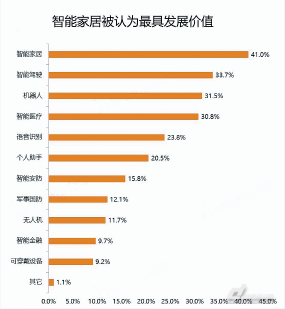 艾媒咨詢分析師認為,智能家居一方面范疇較為廣泛,涉及眾多的家庭產品,另一方面與人們的日常生活息息相關,得到充分發展的智能家居,能夠很大程度地改善人們的生活。智能駕駛、機器人、智能醫療等領域,既能夠有效地提高生產效率,又能夠在生命健康方面給社會帶來價值。
