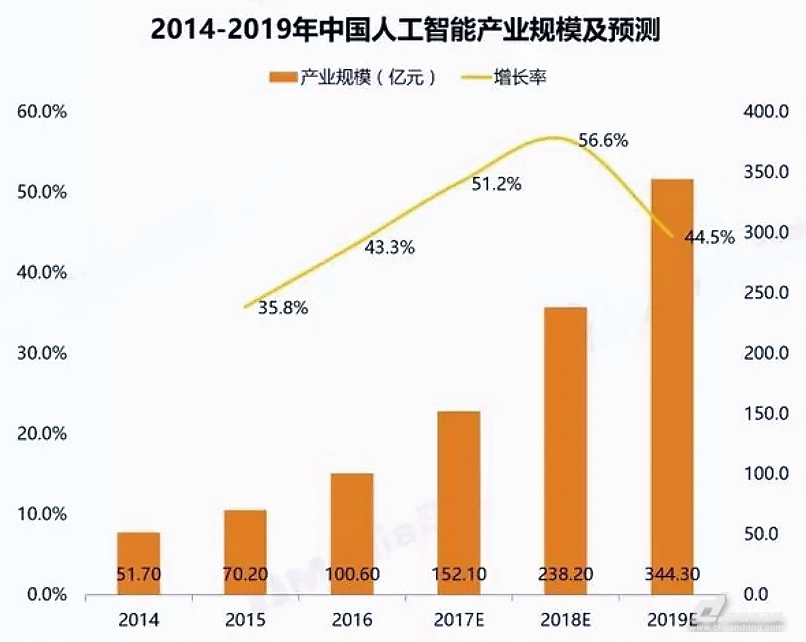 iiMediaResearch(艾媒咨詢)數據顯示,中國人工智能產業規模2016年已突破100億,以43.3%的增長率達到了100.60億元,預計2017年增長率將提高至51.2%,產業規模達到152.10億元,并于2019年增長至344.30億元,見圖2。