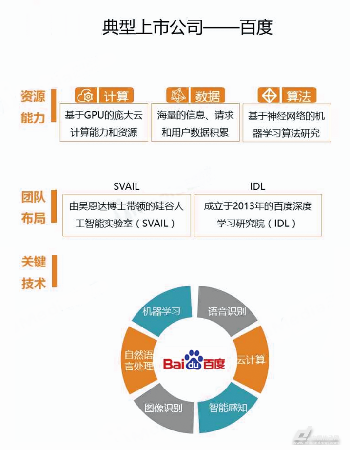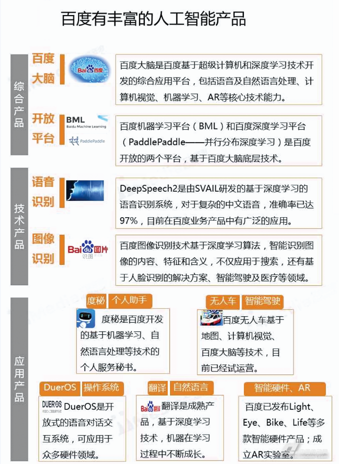 百度是較早布局人工智能的企業之一,自2013年起就開始投入研發,人工智能是百度戰略和戰術上的核心,基于龐大的基礎數據和計算能力,有非常大的研究投入和團隊建設,涉及多項人工智能相關技術領域,目前已有多款成功產品。
