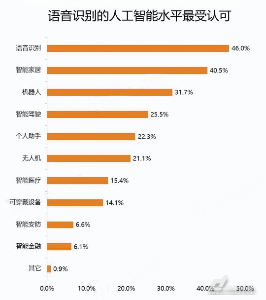 iiMediaResearch(艾媒咨詢)數據顯示,有46.0%的手機網民認為語音識別是人工智能發展水平較高的領域之一,見圖11,緊隨其后的是智能家居,得到了40.5%的手機網民的認可,而機器人、智能駕駛、個人助手、無人機等領域亦得到了較多的手機網民認可,其中,智能安防和智能金融的認可度較低。