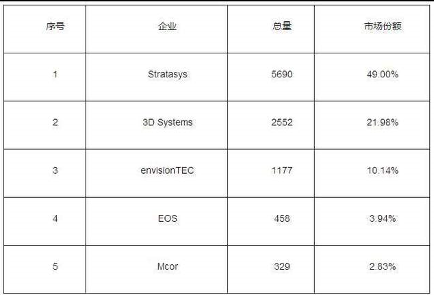 圖表:2015年全球工業(yè)級(jí)/專(zhuān)業(yè)級(jí)3D打印設(shè)備出貨量TOP5企業(yè)
