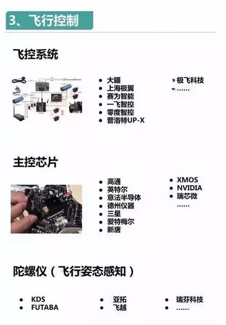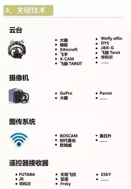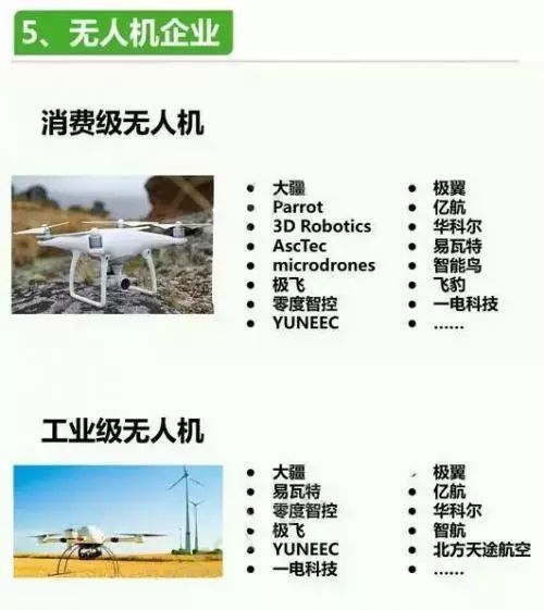 無人機產業(yè)鏈可分為研發(fā)、生產、銷售、服務等細分領域,具體可分為產品研發(fā)試驗、飛控系統(tǒng)開發(fā)、發(fā)動機等關鍵零部件生產、任何載荷制造、無人機整機組裝、無人機銷售、無人機操控培訓、運營服務業(yè)務、一體化應用服務等環(huán)節(jié)。無人機產業(yè)鏈參與者主要包括兩類:一類是像大疆、GoPro這樣的整制造商;另一類則是為無人機提供硬、軟件的上游制造商,包括芯片、飛控、電池、傳感器、GPS、陀螺儀、動力系統(tǒng)、數(shù)據系統(tǒng)、圖傳系統(tǒng)、電子元器件、無人機培訓等等。